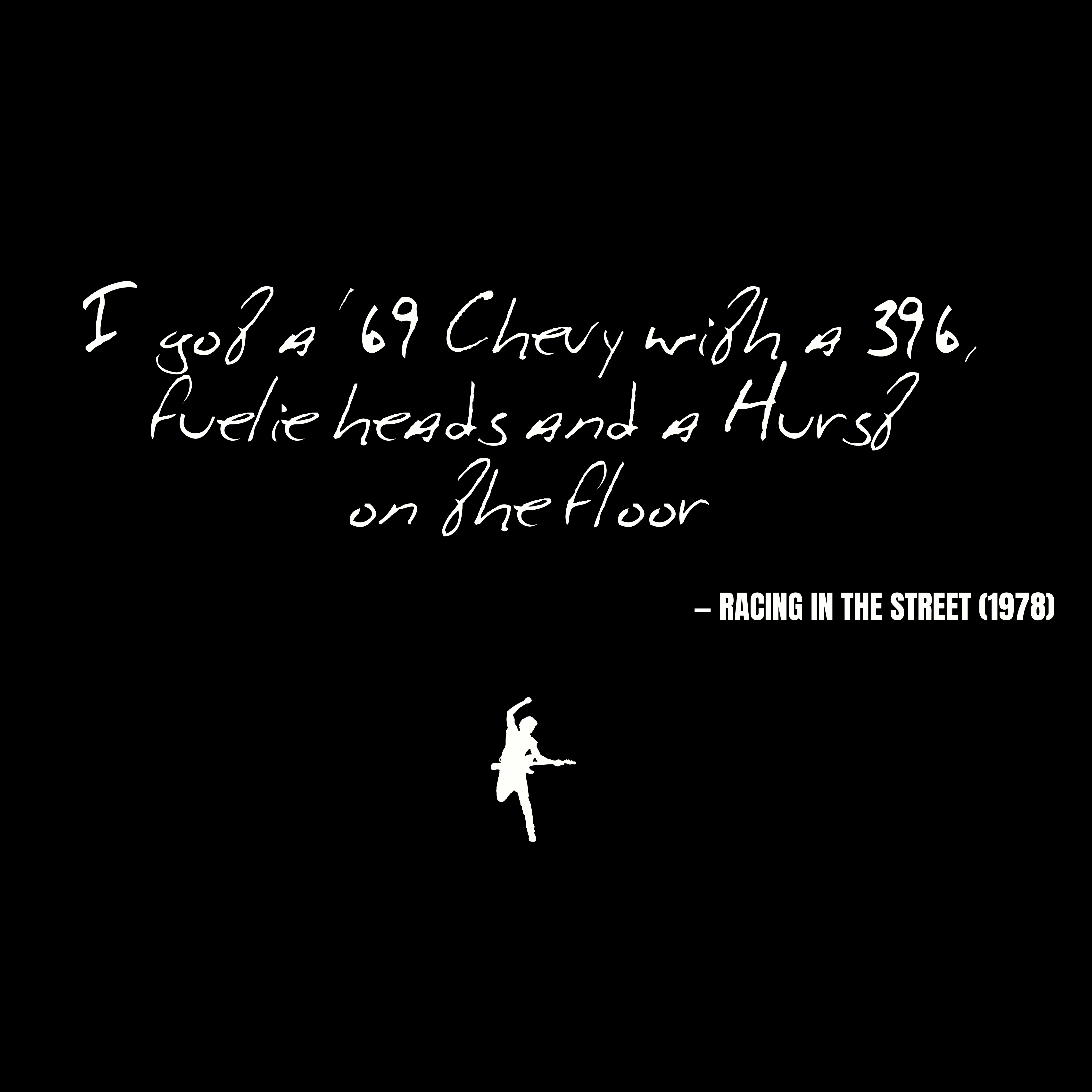 Capture the essence of rock 'n' roll nostalgia with our exclusive Springsteen lyric shirts, featuring the iconic line "I got a '69 Chevy with a 396, fuelie heads and a Hurst on the floor - Racing in the Street." This t-shirt is more than just clothing; it's a piece of musical history woven into fabric, designed specifically for those who appreciate Bruce Springsteen's profound impact on rock music.